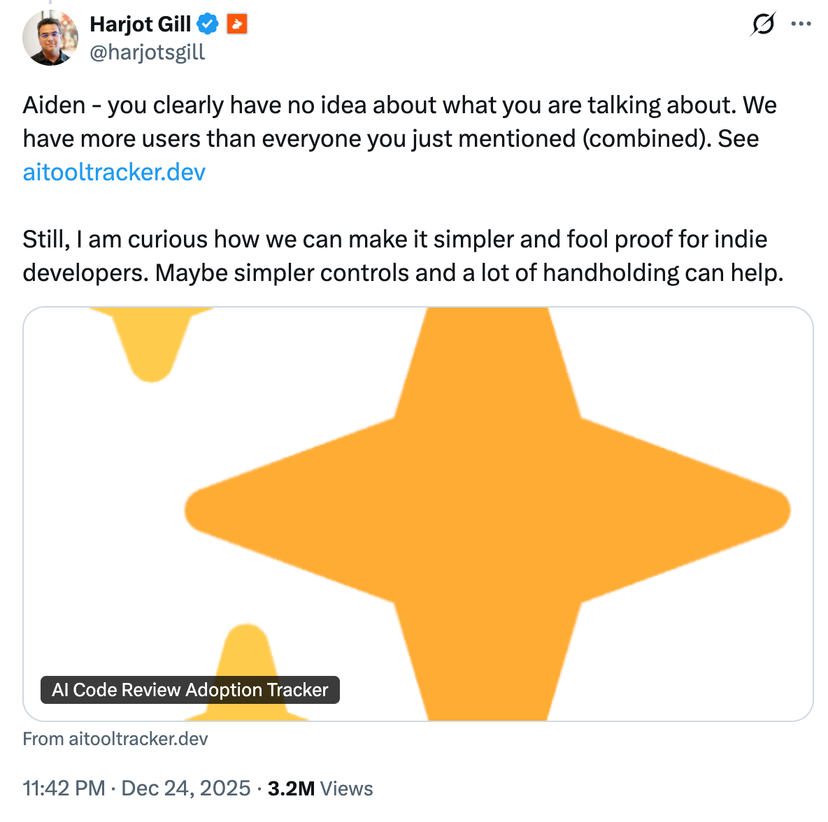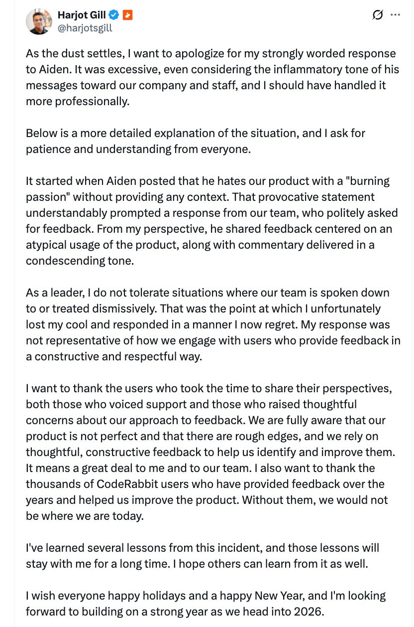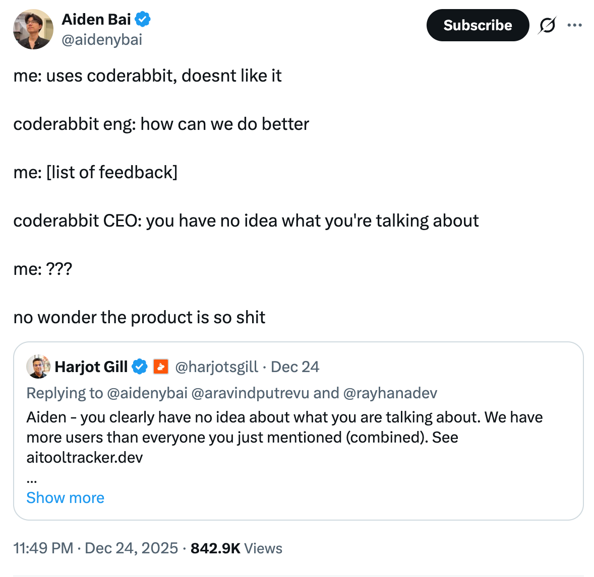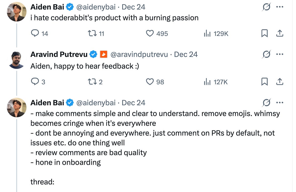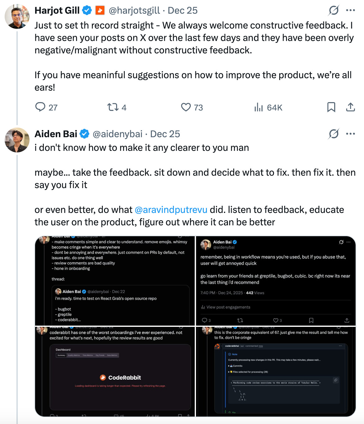 Last week, Aiden Bai posted about grievances with CodeRabbit. Pretty normal so far; users complain about products all the time. A CodeRabbit engineer jumped in to ask for feedback, which was good, and Aiden followed up with details (full context here):